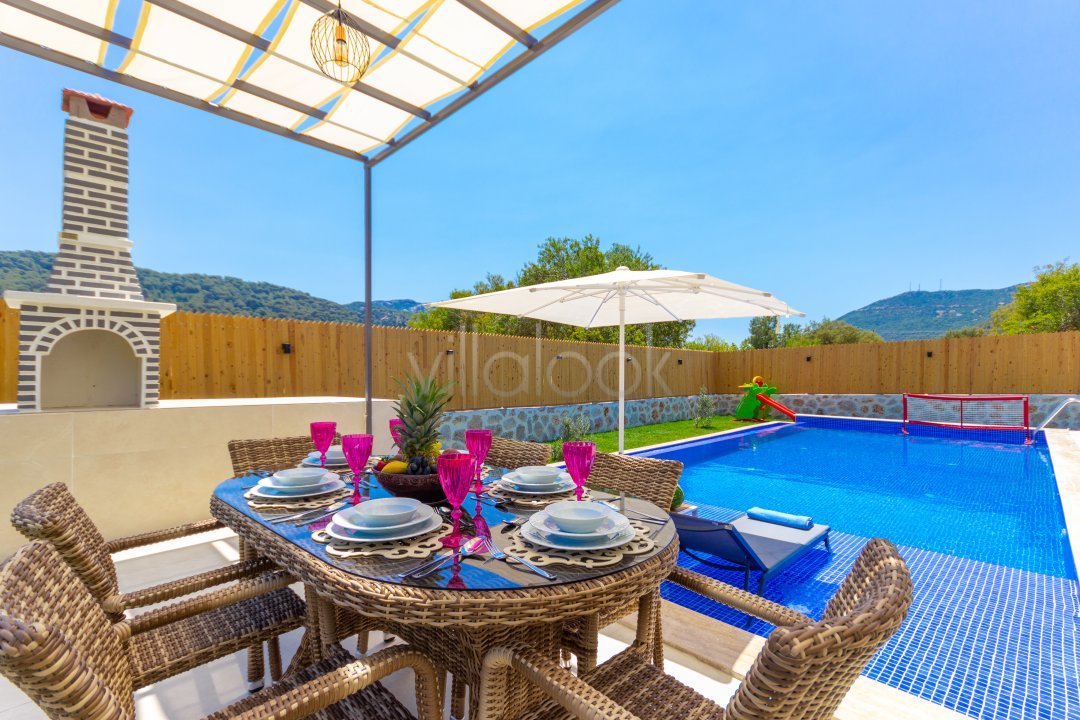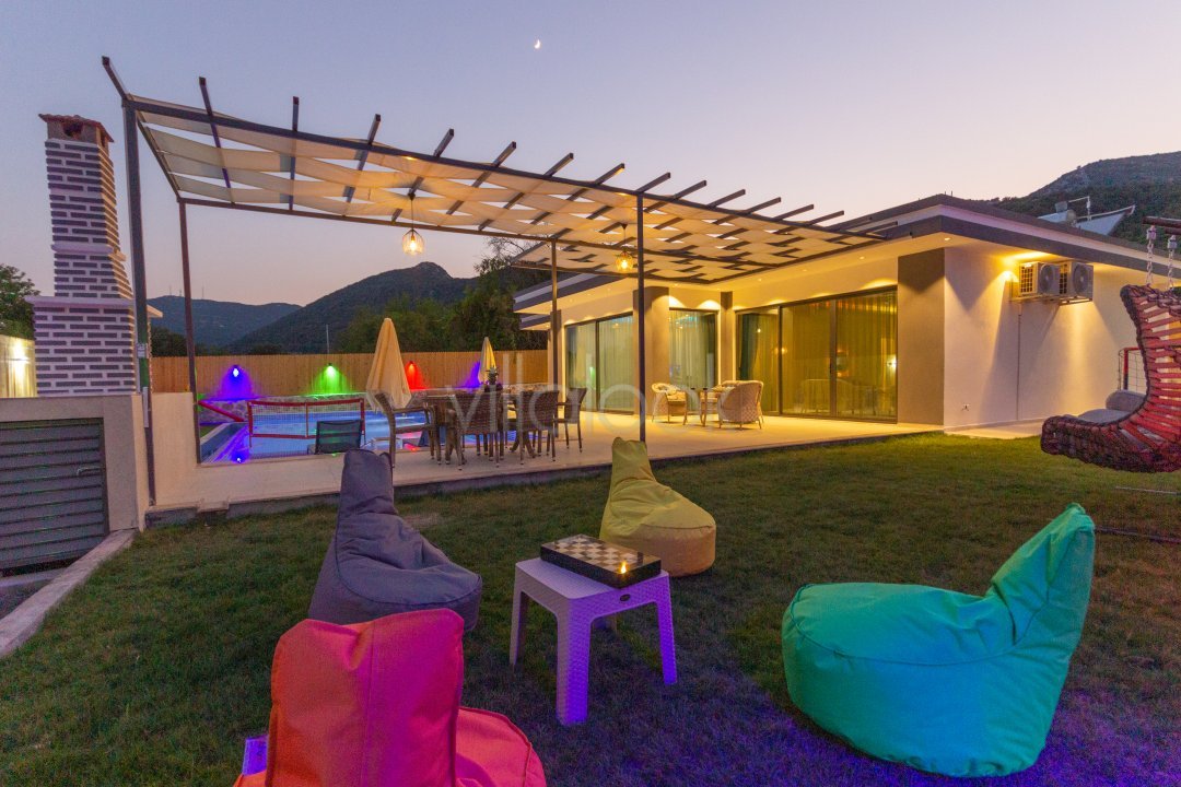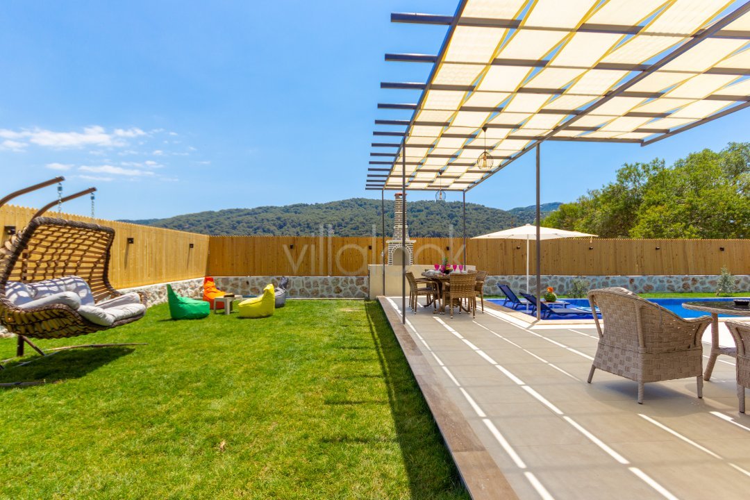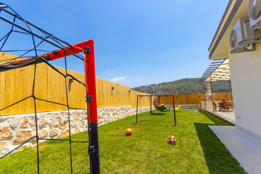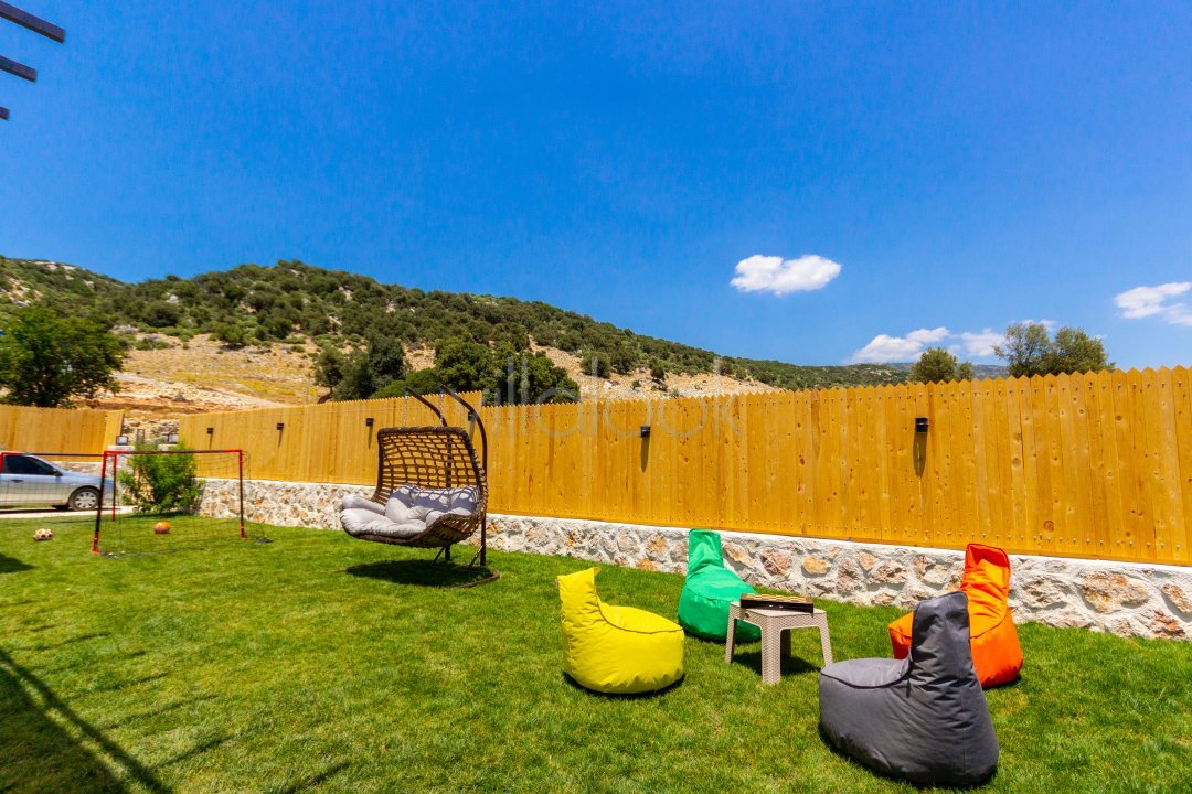 Villanın korunaklı bahçesinde özel yüzme havuzu, şezlonglar, salıncak, mini halı saha, oturma köşesi, yemek masası ve barbekü alanı yer almaktadır. Bu geniş ve kullanışlı alan, misafirlerin gün boyu keyifli vakit geçirebileceği rahat bir ortam sunar.