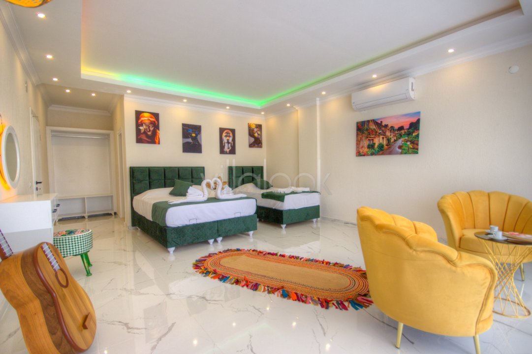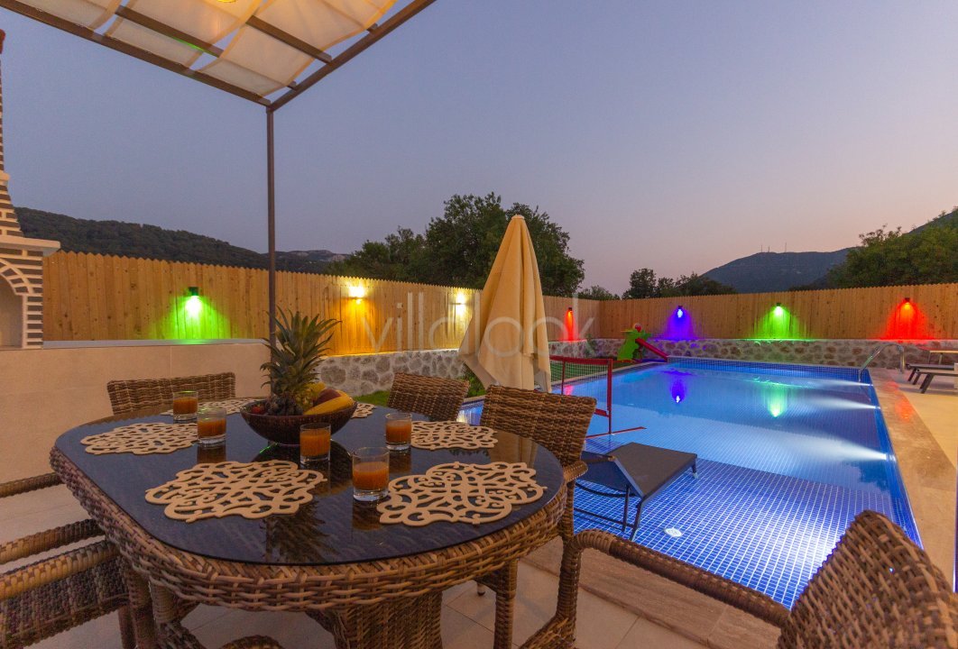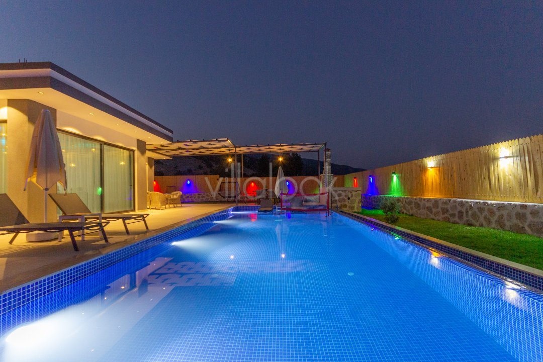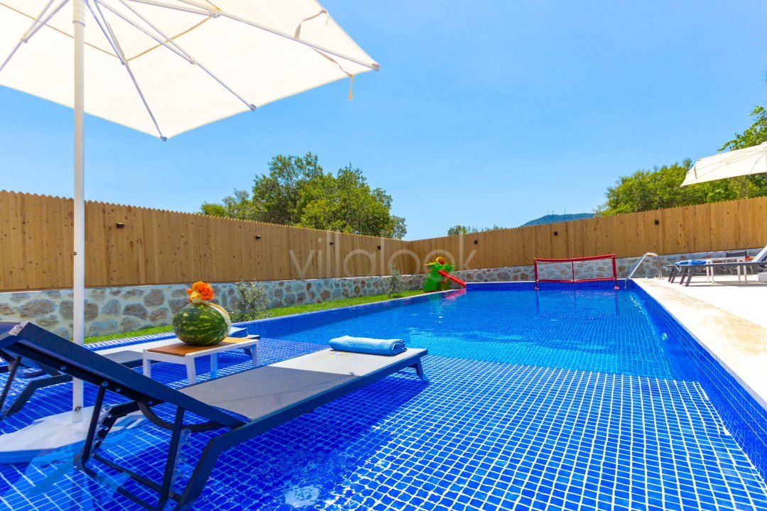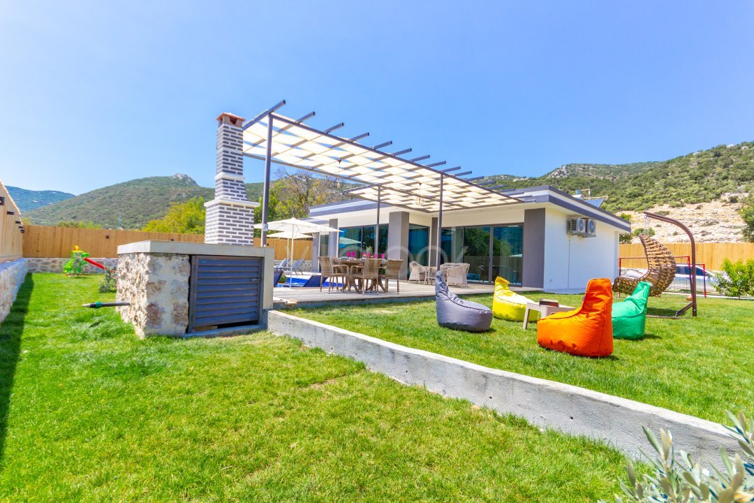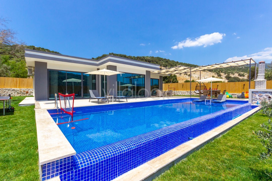Villanın korunaklı bahçesinde özel yüzme havuzu, şezlonglar, salıncak, mini halı saha, oturma köşesi, yemek masası ve barbekü alanı yer almaktadır. Bu geniş ve kullanışlı alan, misafirlerin gün boyu keyifli vakit geçirebileceği rahat bir ortam sunar.