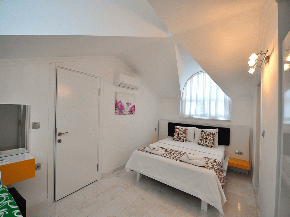 Detayları: Çift kişilikyatak, Komodin, Klima, Elbise dolabı, Makyaj masası, Banyo ve havuz cepheli çiftbalkon bulunmaktadır.