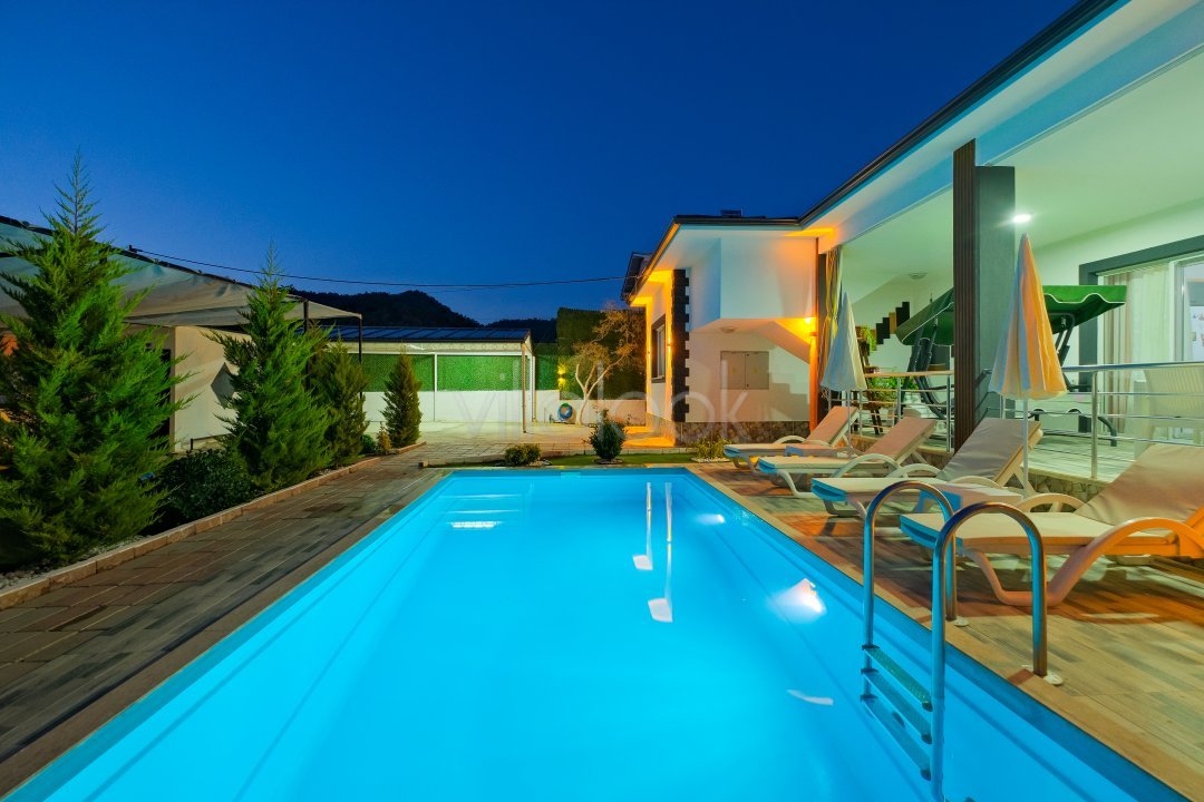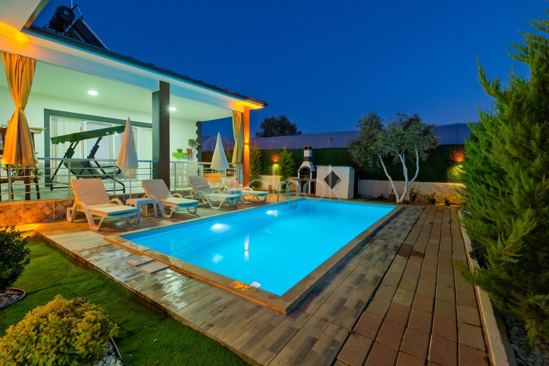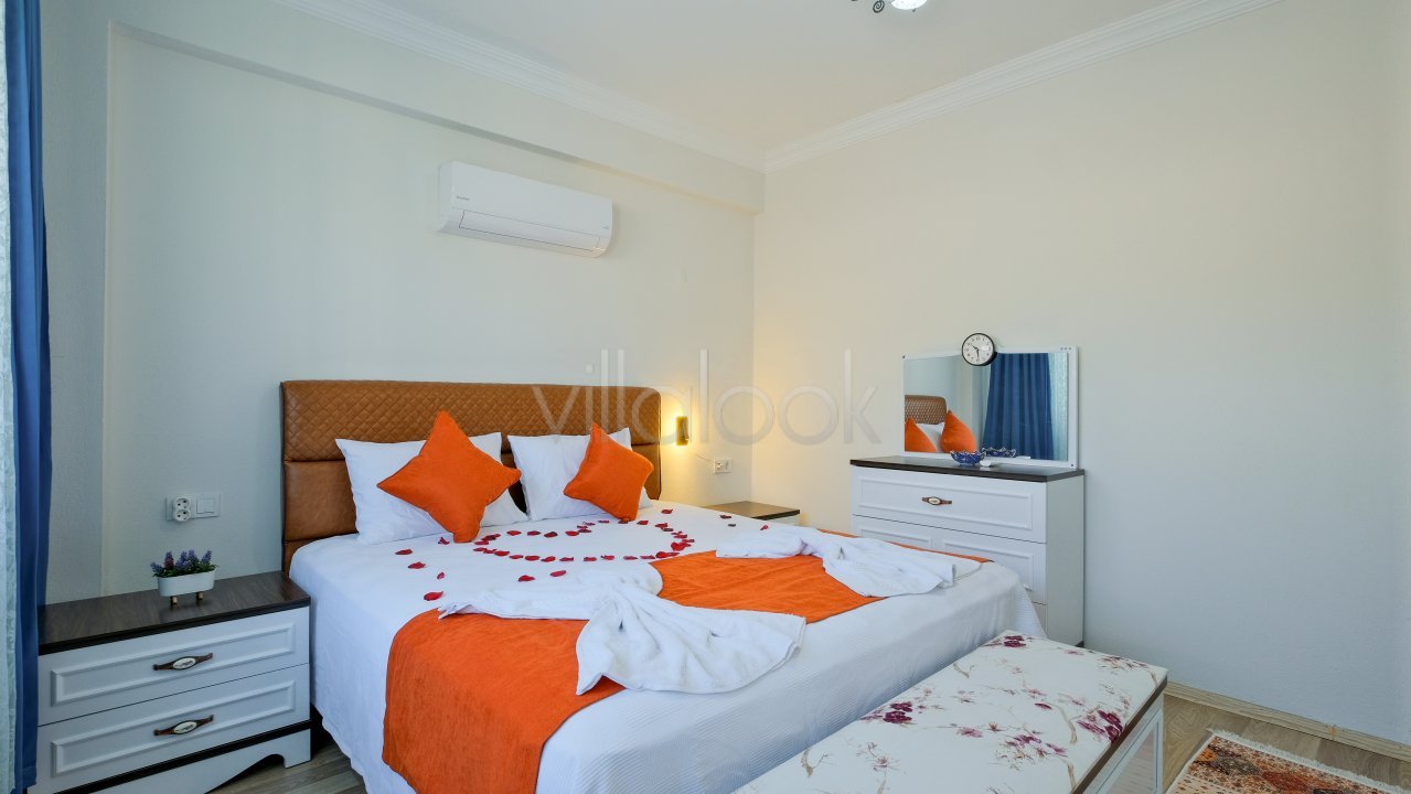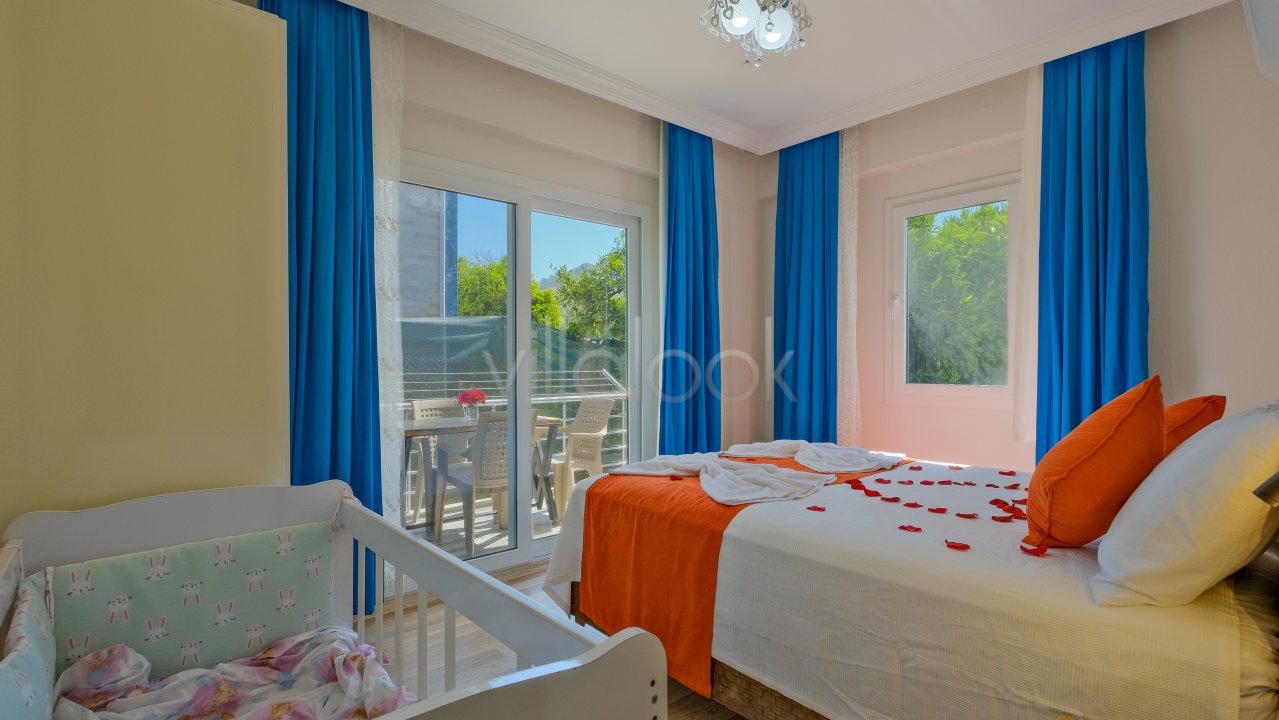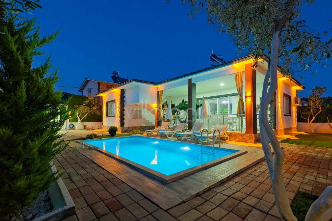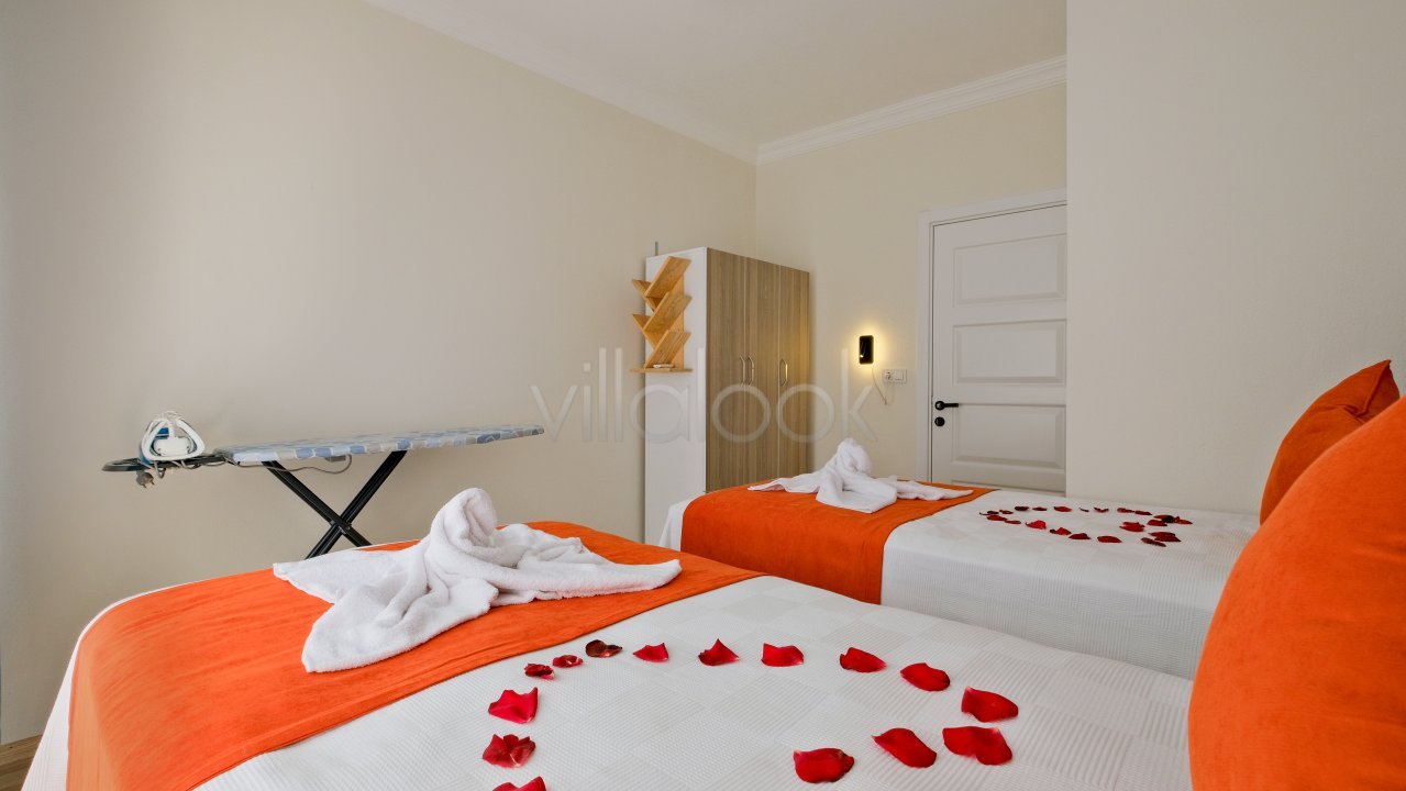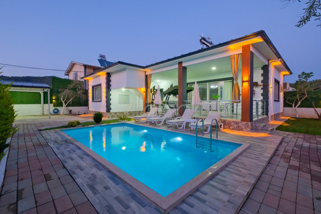 Villamızda 3 adet yatak odası ve 2 adet banyo bulunmaktadır. Birinci yatak odası içerisinde bir adet çift kişilik yatak, ebeveyn banyosu ve klima; ikinci yatak odası içerisinde bir çift kişilik yatak ve klima; üçüncü yatak odasında ise iki adet tek kişilik yatak ve klima mevcuttur. Ortak alanda ise açık mutfak salon, klima, WC-banyo ve TV bulunmaktadır. Villamız maksimum 6 kişilik konaklama kapasitesine sahiptir.
