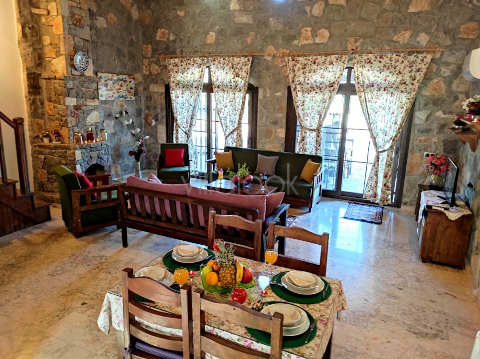 Salon: Açık mutfak-salon, şömine, klima, koltuk takımı, 6 kişilik yemek masası, LCD tv, uydu alıcısı ve mama sandalyesi bulunmaktadır.