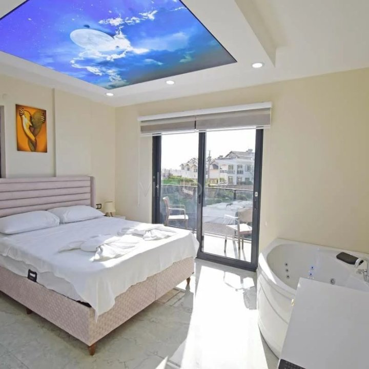 1.Yatak Odası : Oda içerisinde 1 adet çift kişilik yatak, komodin, kıyafet dolabı, TV, klima ,jakuzi ve özel banyo/WC yer almaktadır. (1. Kat)