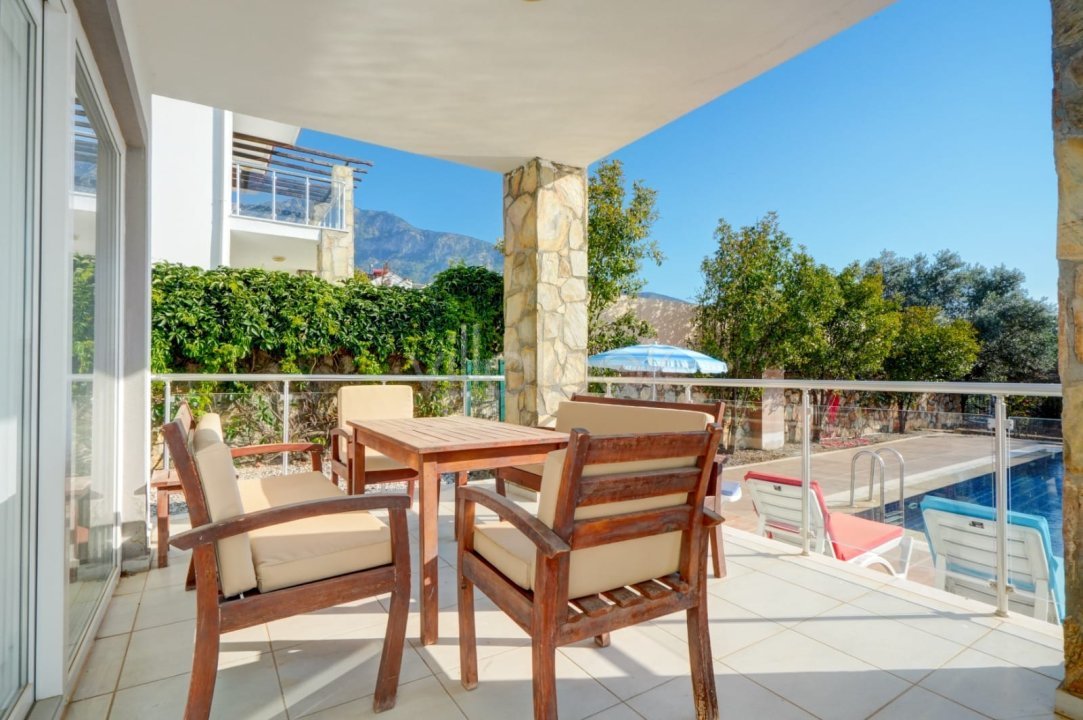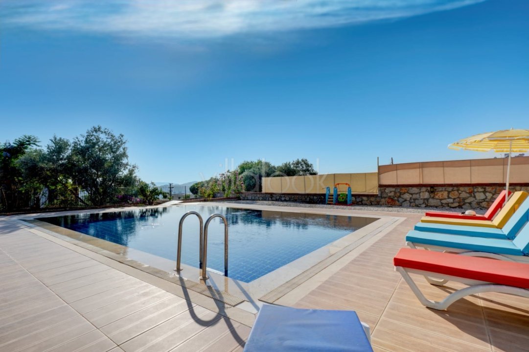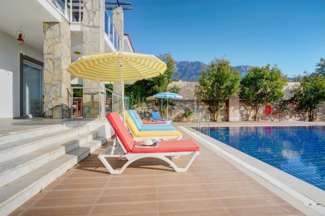 Bahçe Güneşlenmealanı, özel havuz, duş, 10 adet şezlong ve oturma grubu.