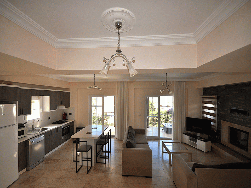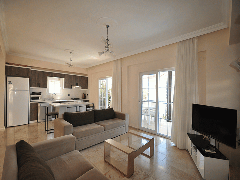 Detayları: Oturma grubu, Uydu TV,İnternet, Klima ve 6 kişilik ada yemek masası bulunmaktadır.